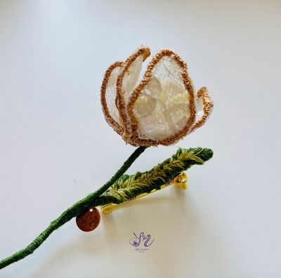 Salon de Reine Paris est une marque de bijoux brodés basée à Paris, qui crée des motifs originaux inspirés par des pétales, des fleurs, des plantes, des insectes et des voyages en France. Chaque pièce est réalisée à la main, grâce à une broderie minutieuse. La technique de broderie fondamentale utilisée est connue sous le nom de broderie haute couture. Son nom officiel, la broderie de Lunéville, est une technique traditionnelle indispensable à l’essor de la haute couture française. Elle a vu le jour en 1865 dans la ville de Lunéville, au nord de la France. Principalement employée pour la confection de robes de haute couture, cette méthode consiste à coudre perles et paillettes, une à une, à la main. En 2020, cet art a été inscrit au patrimoine culturel immatériel de l’UNESCO. Point après point, l’utilisation du crochet pour disposer ces minuscules matériaux crée une œuvre empreinte de beauté et d’émotion. En particulier, les perles vintage extrêmement rares et minuscules, impossibles à enfiler sur une aiguille, trouvent leur place grâce à la technique de broderie de Lunéville au crochet. Certaines créations mélangent également broderie à l’aiguille et broderie de Lunéville, selon les spécificités des œuvres. Laissez-vous émerveiller par ce monde miniature, créé à partir d’un crochet de Lunéville.